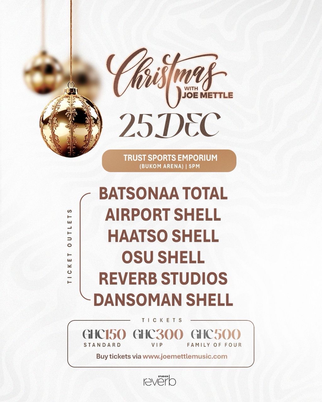 Tickets are available online at www.joemettlemusic.com and at selected outlets including Batsonaa Total, Airport Shell, Haatso Shell, Osu Shell, Reverb Studios, and Dansoman Shell.