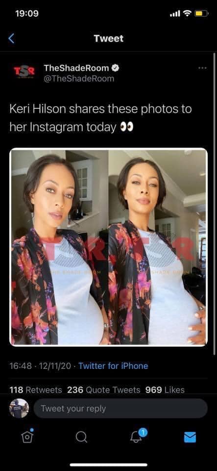 TheShadeRoom shared photos of Keri Hilson’s baby bump on Twitter with the caption; “Keri Hilson shares these photos to her Instagram today”.