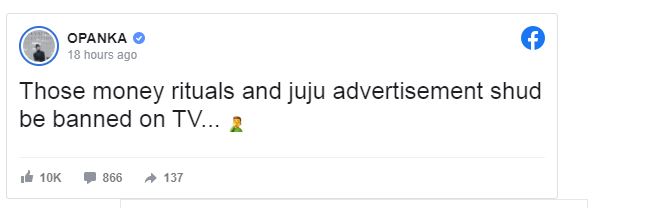 Against this background, the ‘Hajia’ hit-maker has suggested a ban should be placed on all ritual and juju advertisements on TV.