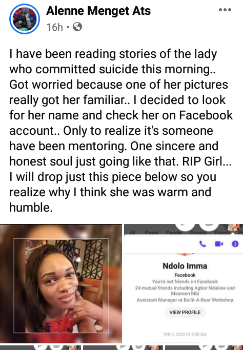 “I have been reading stories of the lady who committed suicide this morning.. Got worried because one of her pictures really got her familiar.. I decided to look for her name and check her on Facebook account.. Only to realize it’s someone have been mentoring. One sincere and honest soul just going like that. RIP Girl… I will drop just this piece below so you realize why I think she was warm and humble”