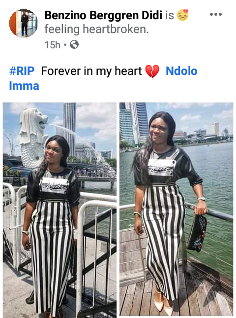 An Nche wrote: “Ndolo Imma, you didn’t deserve to die for that which itself is the source of happiness to many ! A counterfeit man wasn’t worth your tears, talk lest of your soul. A tall, intelligent, beautiful, electric, fashionable and genuine person ! Our paths crossed on facebook sometime ago. You were so true and total ! What will make a man do this to you? What will bring you to give up on life? So young ? May your gentle soul rest in peace!”