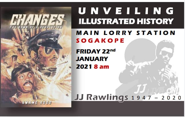 Human history before the invention of writing, has come down to us in the form of art work, for example the numerous prehistoric cave paintings and drawings that abound all over the world, testify to this fact. The illustrated book, Changes: The Dawn Of A Revolution, conveys a vivid impression of the legendary Flt. Lt. Jerry John Rawlings not only in the part he played in Ghana’s June 4th Revolution, but further engages our attention with background information which enhances his personality as a heroic figure.