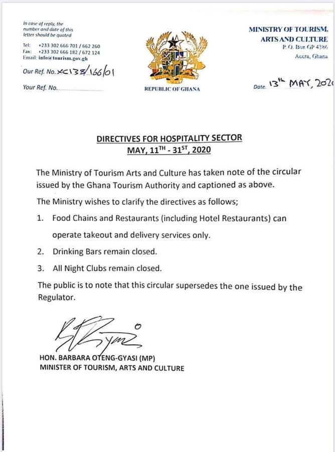 The clarification has become necessary following a statement from the Ghana Tourism Authority (GTA) indicating that hotels, restaurants and bars could resume operations albeit with enhanced social distancing protocols.