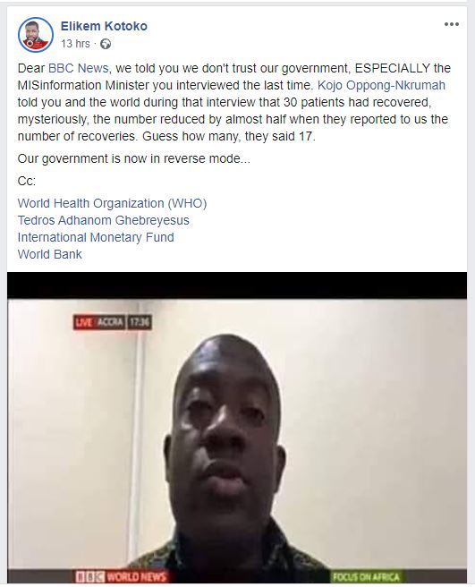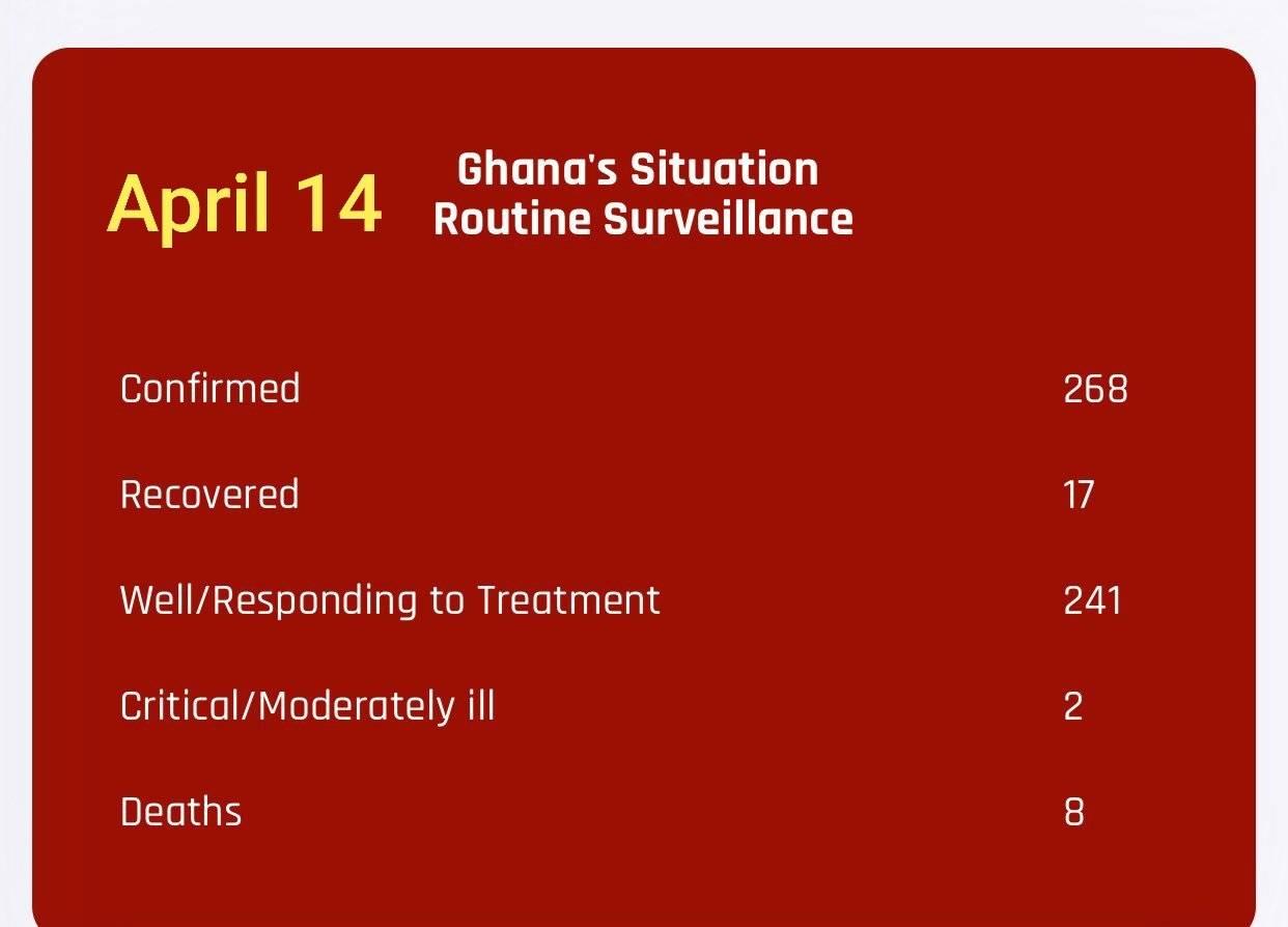 Meanwhile, the actual government figure of recovered patients from the virus as of April 14, 2020, stands at 17 and not the 30 the same Oppong Nkrumah had told BBC.