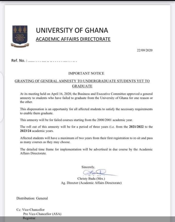 The University of Ghana (UG) has granted amnesty to former students of the university who failed to graduate due to their inability to pass their courses.