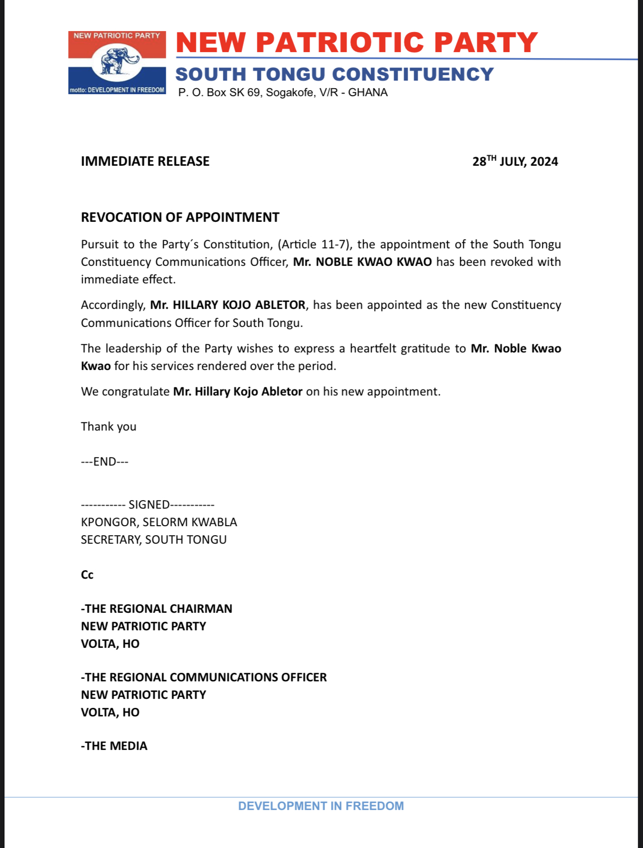 Pursuit to the Party’s Constitution, (Article 11-7), the appointment of the South Tongu Constituency Communications Officer, Mr. NOBLE KWAO KWAO has been revoked with immediate effect.