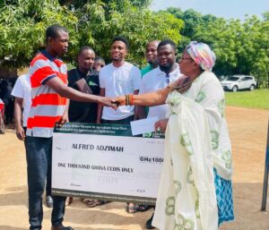 Mama Sename III, the paramount queen mother of Mafi Traditional Council, presented the donation on behalf of the company. She encouraged the awardee, Mr. Alfred Adzimah to continue to work hard.