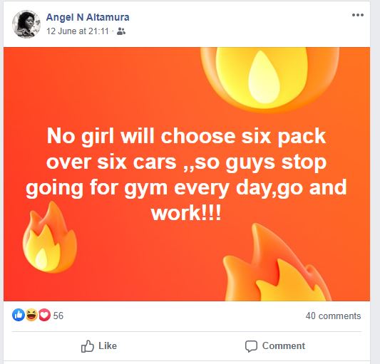 “No girl will choose six-pack over six cars,, so guys stop going for the gym every day, go and work!!!”