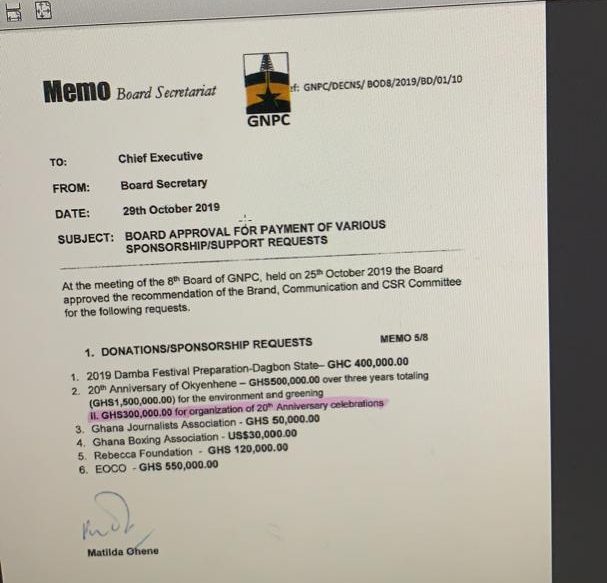 The memo mentioned that “At the meeting of the Board of GNPC, held on 25th October 2019 the Board approved the recommendation of the Brand, Communication and CRS Committee for the following requests”.