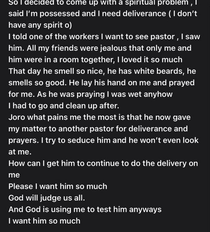 A young beautiful lady has made a shocking confession of having lust-ful a feeling towards to her Pastor who is legally married.