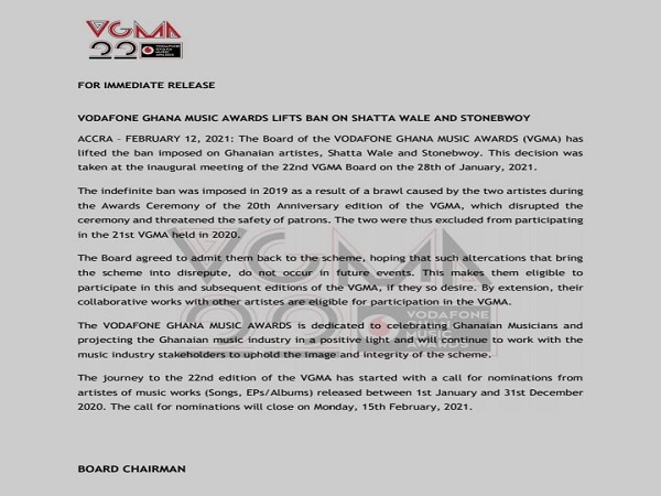 VGMA Board on Friday, February 12, 2021 released a press statement indicating that it has “lifted the ban imposed on Ghanaian artistes, Shatta Wale and Stonebwoy”.