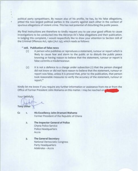 “My instructions are that in a recording on a TV programme on Net 2 TV, Madina, Accra which has been circulating on various social media platforms including Facebook and Whatsapp platforms, Abronye made certain false claims alleging a plot masterminded by His Excellency John Dramani Mahama to assassinate some NPP personalities including he, Abronye DC, himself…,” part of the letter read.