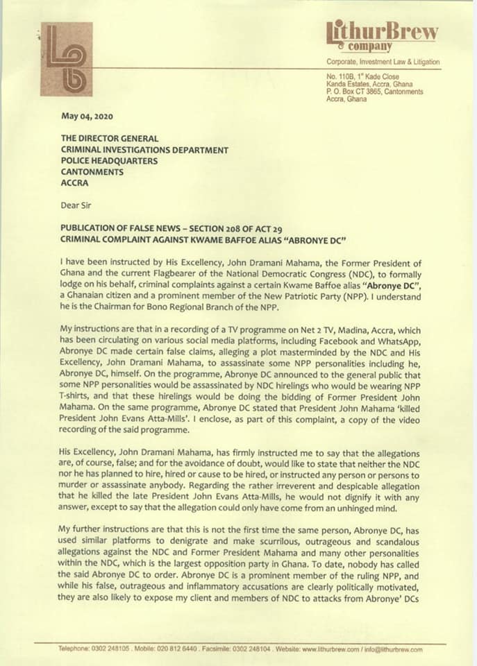 “My instructions are that in a recording on a TV programme on Net 2 TV, Madina, Accra which has been circulating on various social media platforms including Facebook and Whatsapp platforms, Abronye made certain false claims alleging a plot masterminded by His Excellency John Dramani Mahama to assassinate some NPP personalities including he, Abronye DC, himself…,” part of the letter read.
