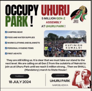 Kenyan youth are gearing up for a significant protest scheduled for Thursday, July 18, 2024, labeled “Occupy Uhuru Park.” The event, aiming to gather 5 million participants at Nairobi’s Uhuru Park, has been highlighted in a widely circulated poster.