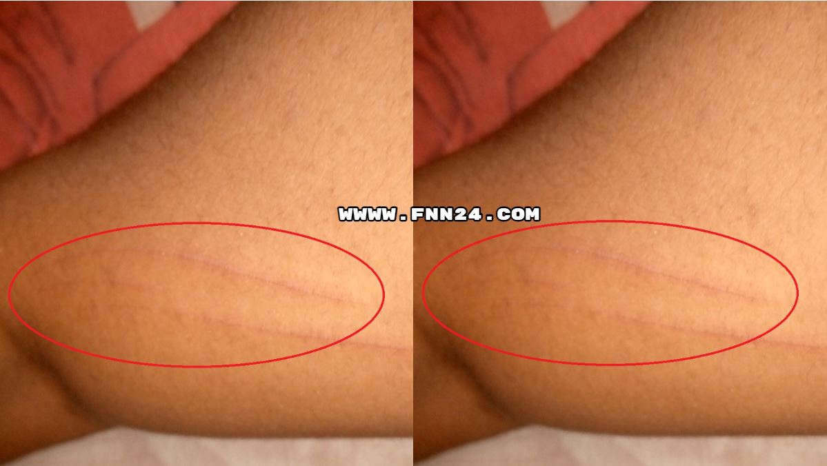 See the photo of the strange marks on her left thigh below;