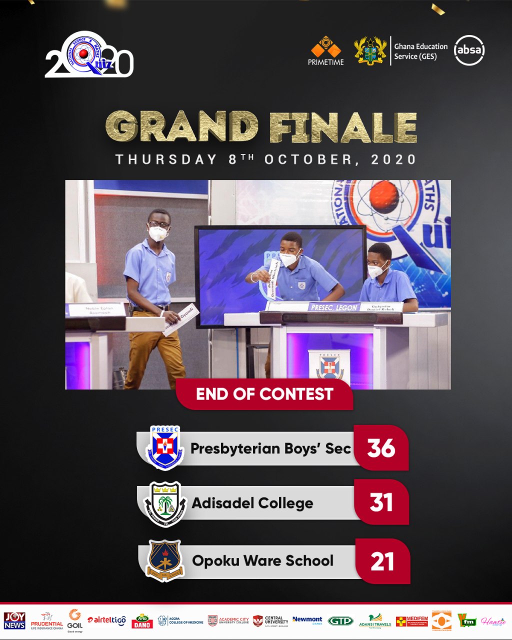 However, by the end of the competition, Presec had a total of 36 points and their close competitors Adisadel had 31 points. OWASS scored 21 points.