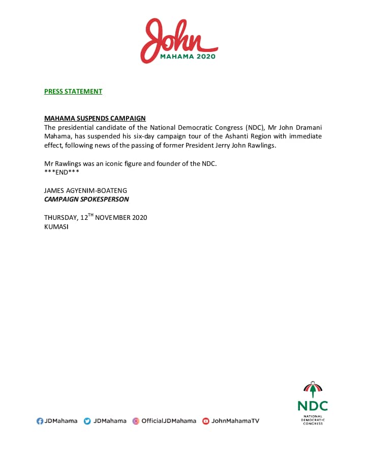 The suspension of the campaign was announced in a statement signed by the spokesperson of the John Mahama campaign, James Agyenim-Boateng.