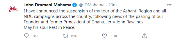 The flagbearer of the National Democratic Congress (NDC), John Mahama, has suspended his six-day campaign tour in the Ashanti region.
