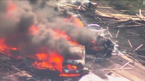 Video from the scene showed firefighters spraying water on towering orange flames and burning cars.