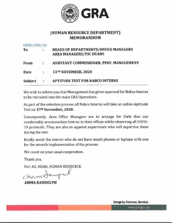 A memo from the Human Resource Department of the GRA has directed heads of department, area managers, among others to begin an online aptitude test today that will enable the interns to be recruited as permanent employees.