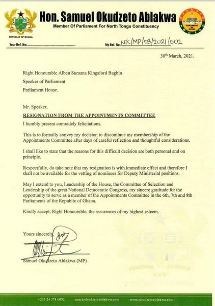 Samuel Okudzeto Ablakwa, the Member of Parliament for North Tongu Constituency has resigned from Parliament’s Appointment Committee (PAC).