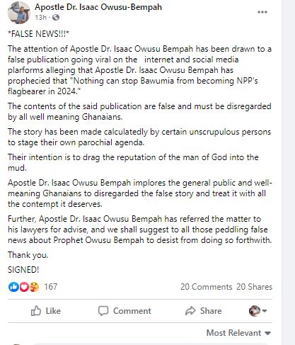The controversial man of God in a post on his official Facebook wall, Rev. Owusu Bempah denied a prophesy attributed to him that “Nothing can stop Bawumia from becoming NPP’s flagbearer in 2024”.
