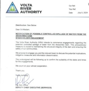 VRA’s Deputy Chief Executive in Charge of Services, Ing. Ken Arthur, signed a letter to the Interior Minister, other respective stakeholders and all the assemblies within the dam’s catchment areas, indicating and informing the possibility of another excess water spillage from the Akosombo Dam if necessary.