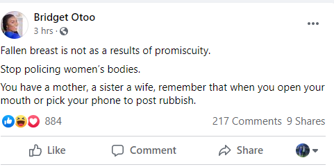 “Fallen breast is not as a result of promiscuity. Stop Policing women’s bodies. You have a mother, a sister, a wife, remember that when you open your mouth or pick your phone to post rubbish”.