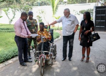 Former President Jerry John Rawlings brought joy to Emmanuel Ofoe, a physically-challenged street beggar, on Friday when he donated an ...