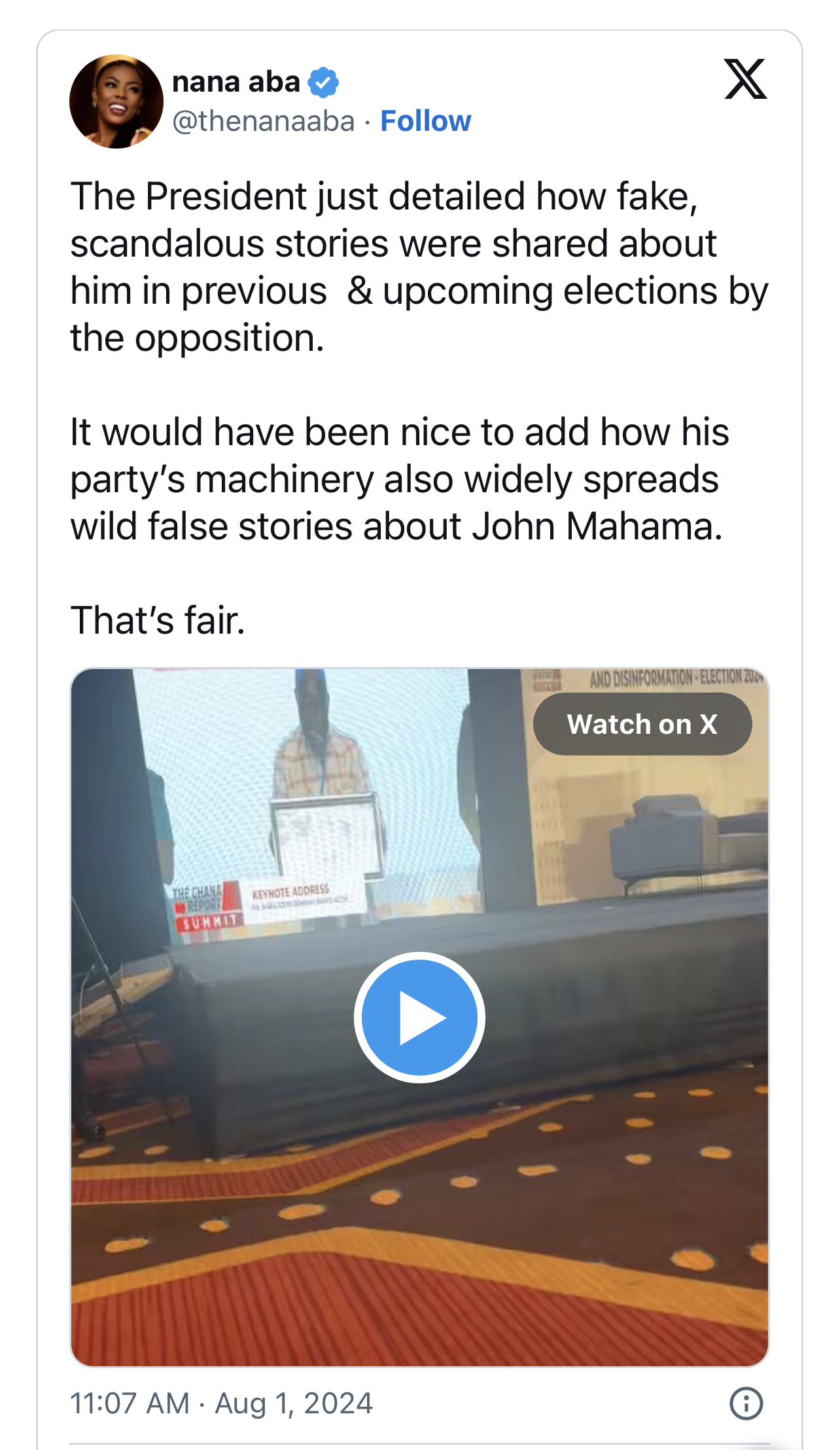 Her tweet read, “The President just detailed how fake, scandalous stories were shared about him in previous & upcoming elections by the opposition. It would have been nice to add how his party’s machinery also widely spreads wild false stories about John Mahama. That’s fair.”