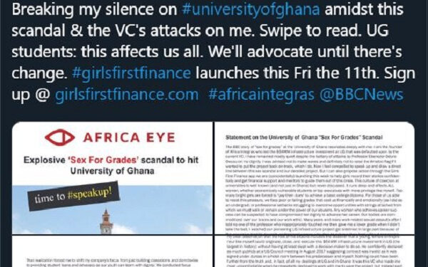 In a tweet, Andrea Pizziconi alleged that the ‘s3x for grade’ investigative piece that incorporated some lecturers at the University of Ghana resonates deeply with her.