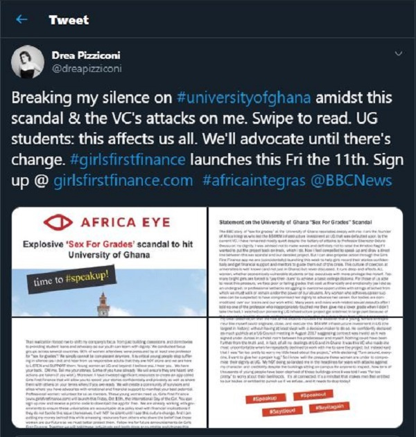 In a tweet, Andrea Pizziconi alleged that the ‘s3x for grade’ investigative piece that incorporated some lecturers at the University of Ghana resonates deeply with her.