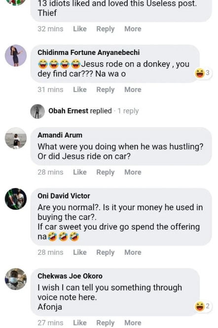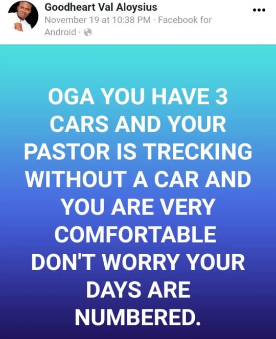 Goodheart Val Aloysius wrote on his Facebook page; “Oga you have 3 cars and your pastor is trekking without a car and you are very comfortable. Don’t worry, your days are numbered.”
